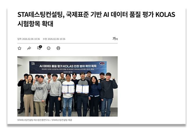 STA는 국제표준 ISO/IEC TR 4213에 따른 인공지능 머신러닝 분류 모델 성능평가 분야에서 이미 KOLAS 공인시험기관 자격을 보유하고 있으며, 이번 평가를 통해 ISO/IEC 5259-2(인공지능 데이터 품질)와 ISO/IEC 25024(소프트웨어 데이터 품질) 시험항목을 추가로 인정받았다. 이에 따라 인공지능 모델 성능과 이를 뒷받침하는 데이터의 품질·성능을 함께 검증할 수 있는 공인시험 체계를 갖추게 됐다.